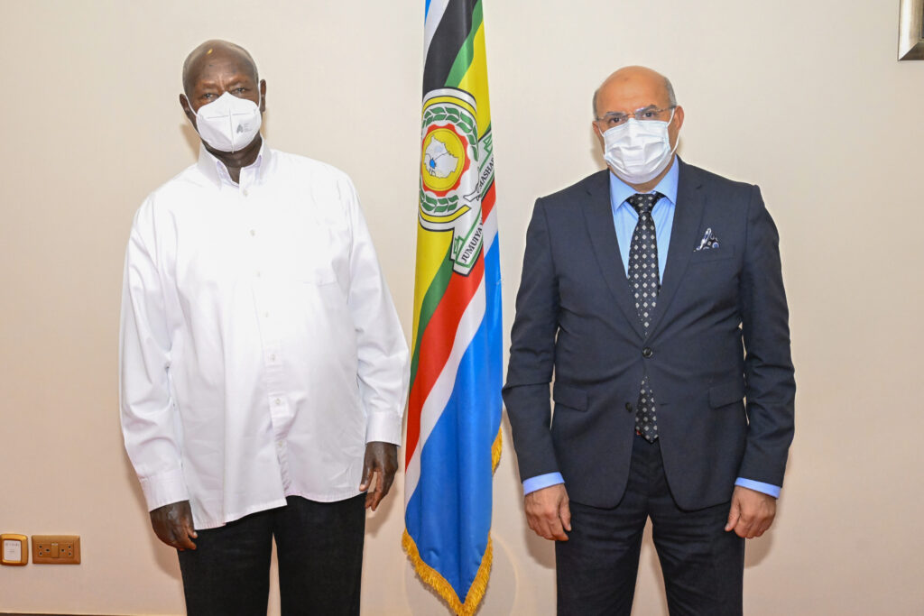 سفير الجزائر، السفير محمد الخليفي على اليمين – رئيس أوغندا موسيفيني على اليسار
