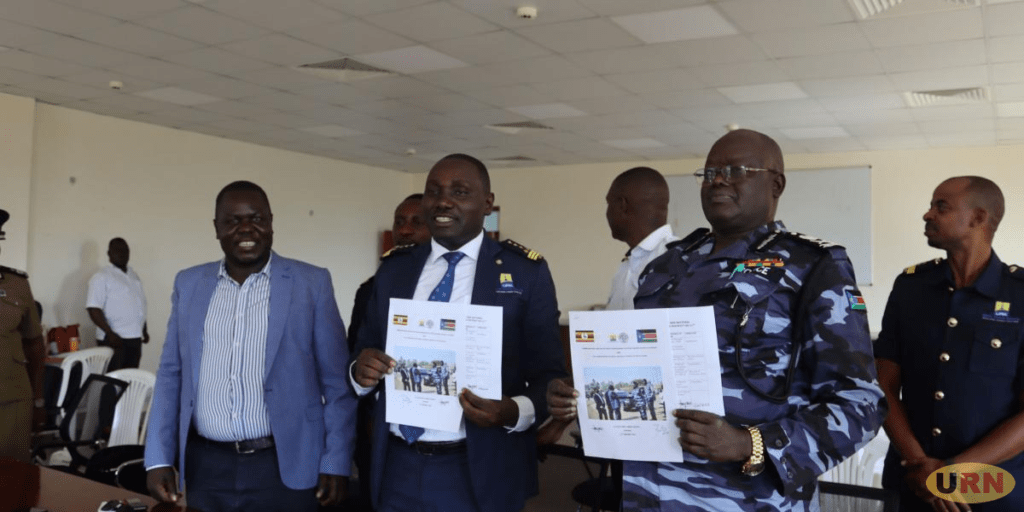 مفوض مقاطعة أمورو المقيم ستيفن أودونج لاتيك ، أبيل كاغومير مفوض الجمارك URA جنرال والجنرال جاثون جوال ريك في صورة بعد اجتماع ثنائي يوم الأربعاء 11-1-2023- صورة URN.