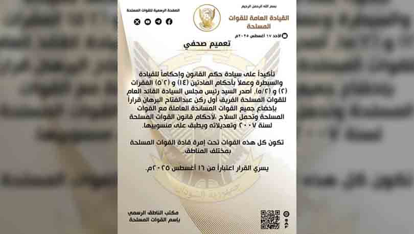 السودان: إخضاع جميع القوات المساندة والحاملة للسلاح لقانون القوات المسلحة