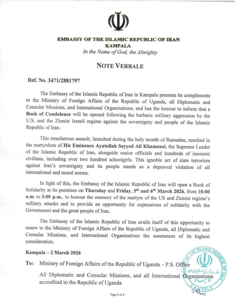 السفارة الإيرانية في كمبالا تعلن عن فتح سجل تعازٍ عقب هجمات أمريكية إسرائيلية
