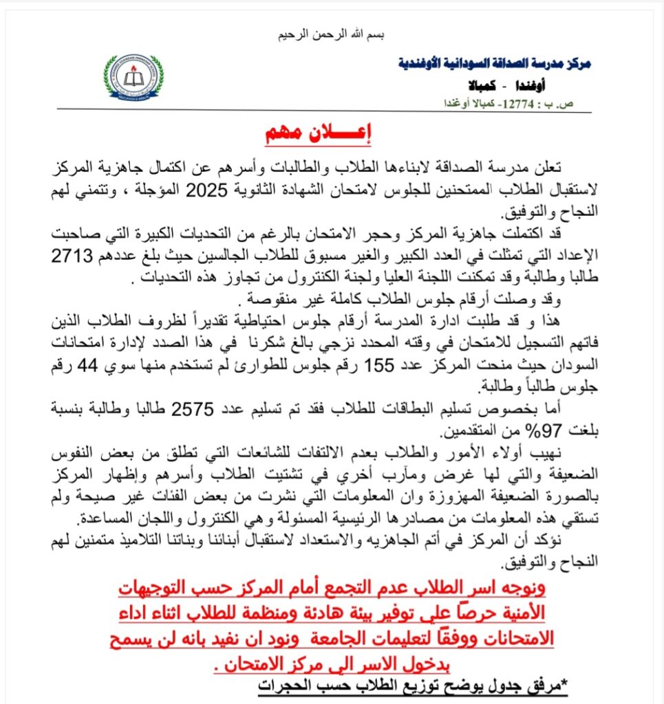 مدرسة الصداقة السودانية في كمبالا تعلن جاهزية مركز الامتحانات لاستقبال طلاب الشهادة السودانية غدا الإثنين